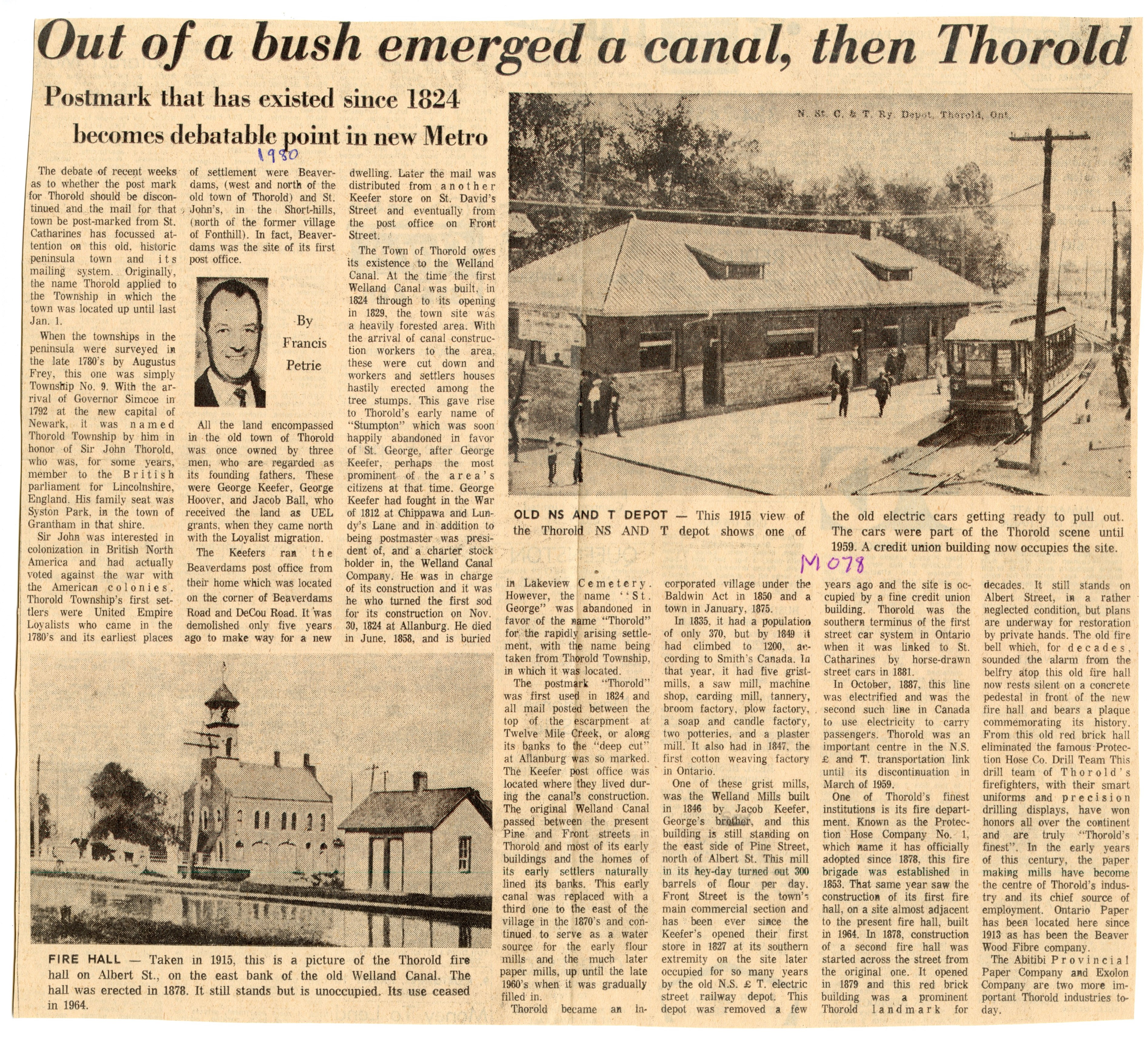 - Out of a bush emerged a canal, then Thorold : Postmark that has existed since 1824 becomes debatable point in new Metro