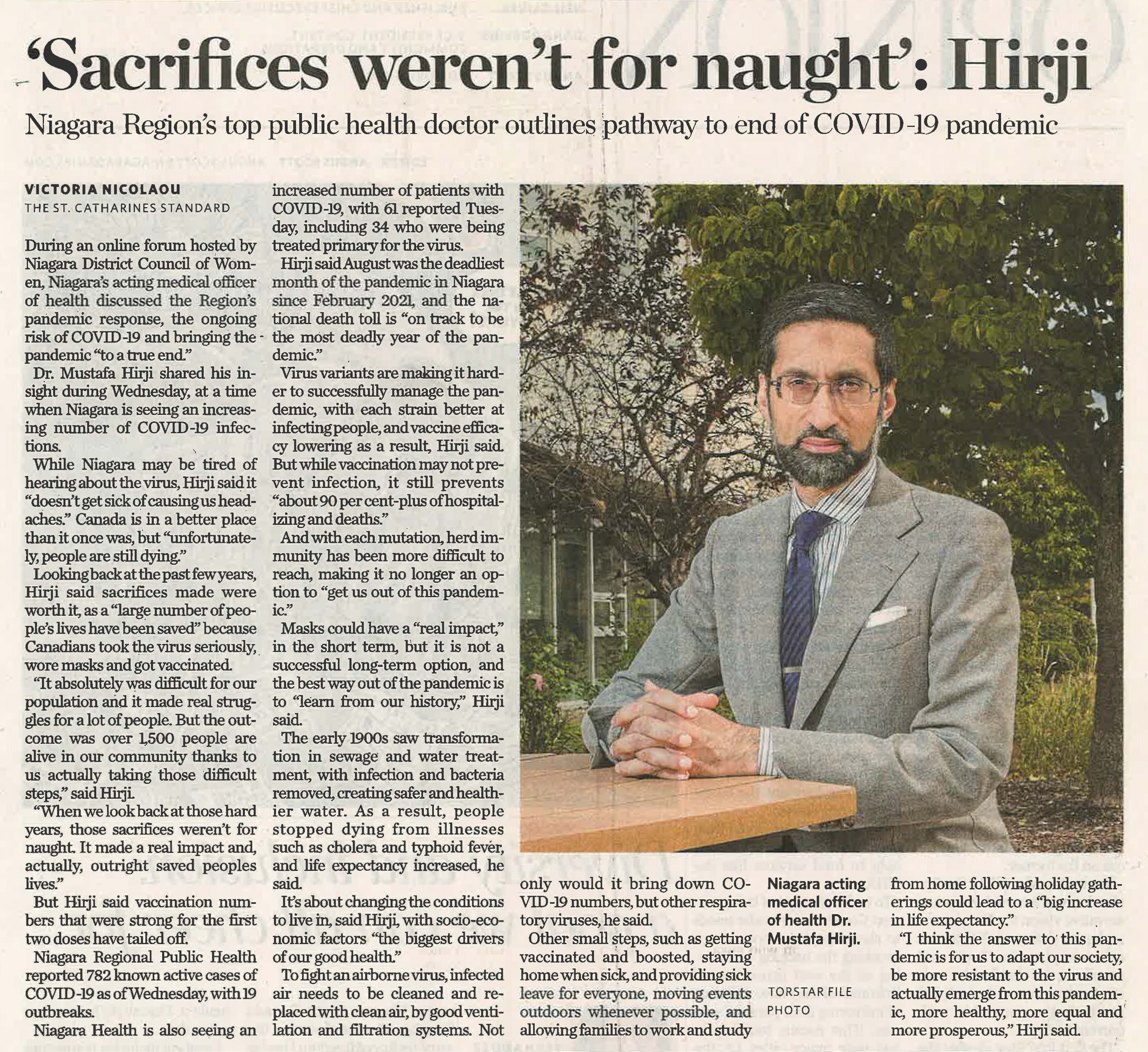 - 'Sacrifices weren't for naught': Hirji : Niagara Region's top public health doctor outlines pathway to end COVID-19 pandemic