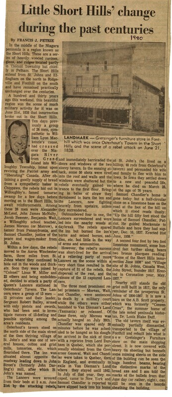 - Short Hills / Petrie, April / Petrie, Sarah Jo / Chandler, Samuel / Scott, Karen & David / Gretsinger's Furniture Store / Osterhout's Tavern / Thorold Township