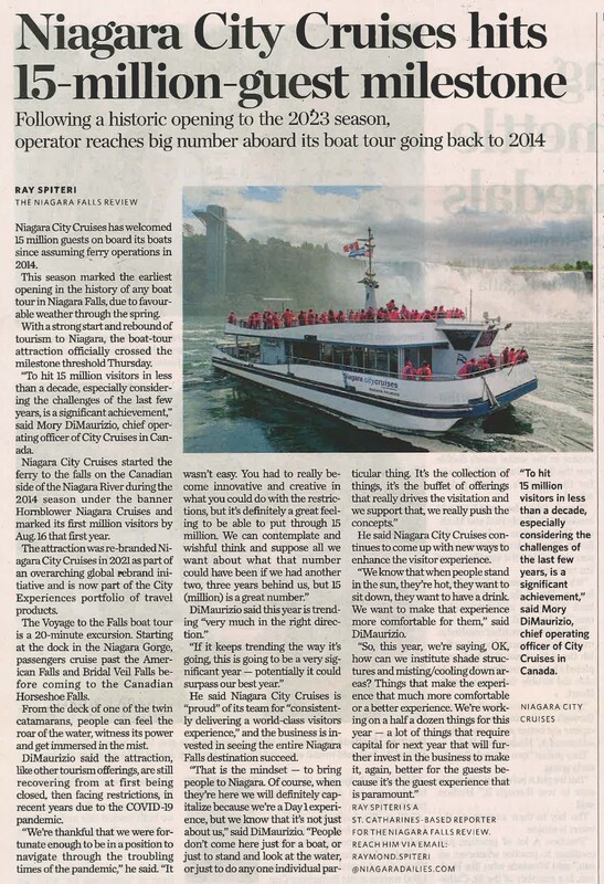 - Niagara City Cruises hits 15-million- guest milestone : following a historic opening to the 2023 season, operator reaches big number aboard its boat tour going back to 2014
