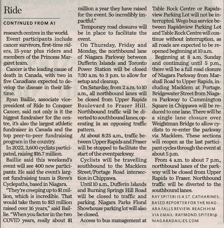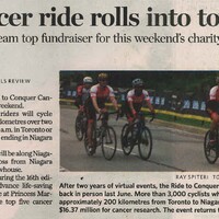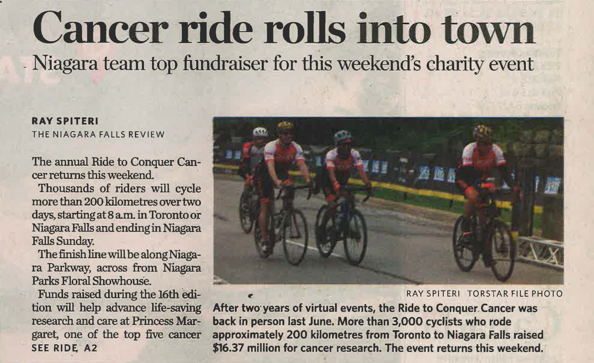 - Cancer ride rolls into town : Niagara team top fundraiser for this weekend's charity event