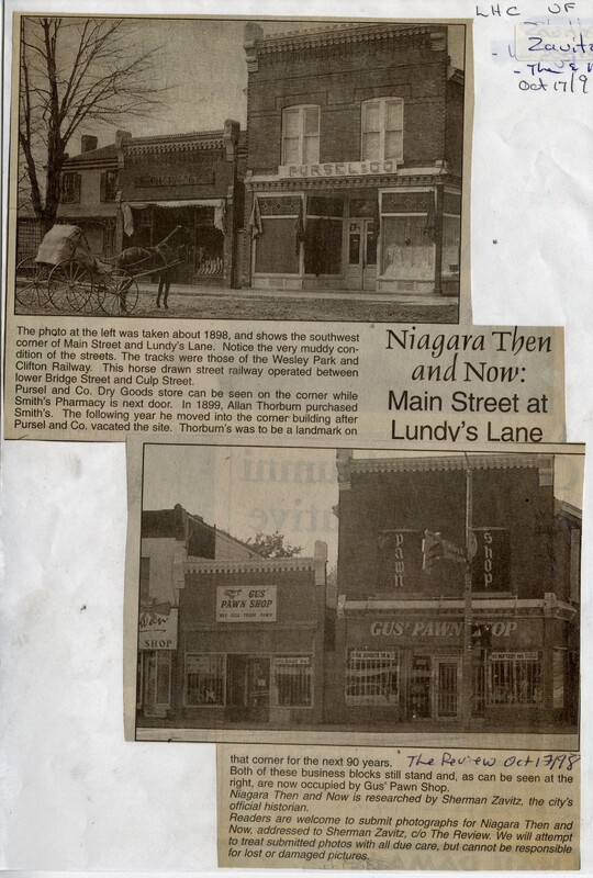 - Main Street / Lundy's Lane / Clifton Railway / Wesley Park / Pursel and Co. Dry Goods / Smith' Pharmacy / Thorburn, Allan / Gus' Pawn Shop