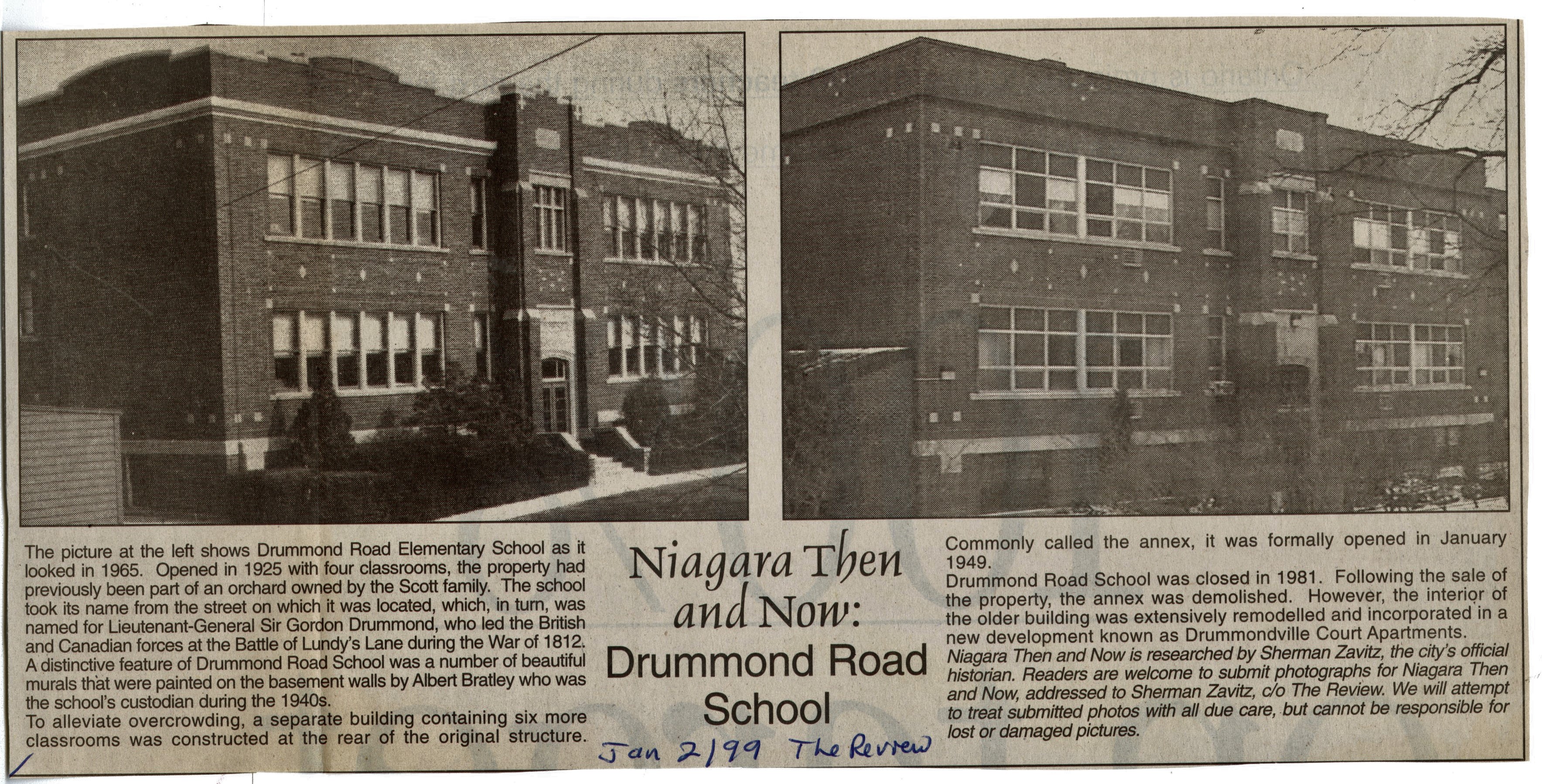 - Drummond Road Elementary School / 1925 Lieutenant General Sir Gordon Drummond / painted murals / Bratley, Albert / Drummondville Court Apartments