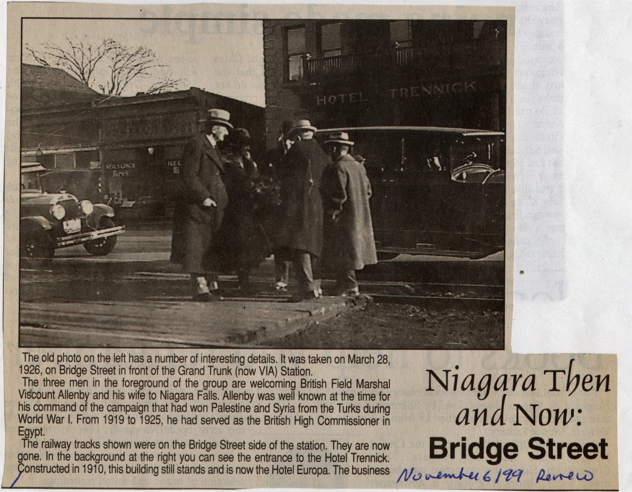 Bridge Street 1928 / Grand Trunk Station / Allenby, Viscount / Hotel Trennick 1910 / Wiliam Dawson's Restaurant / Edward Breault's Barber Shop / Hansel, Wilfred