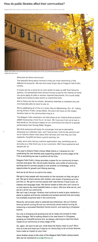 - How do public libraries affect their communities? Niagara Falls Public Library is holding a special Library Day event on Oct. 22