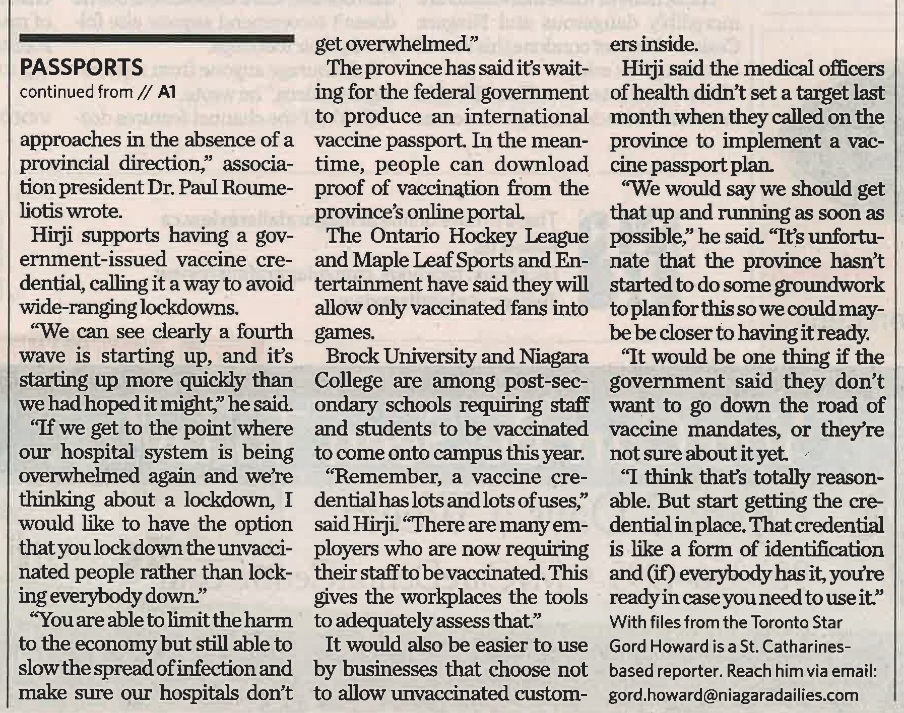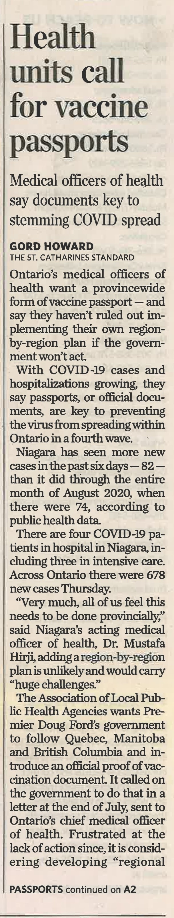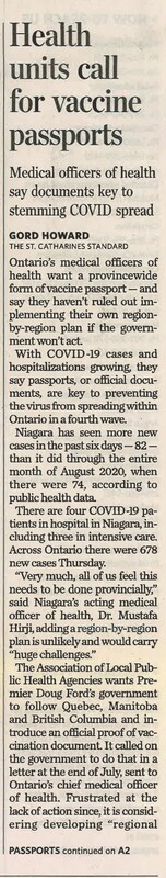 - Health units call for vaccine passports : medical officers of health say documents key to stemming COVID spread