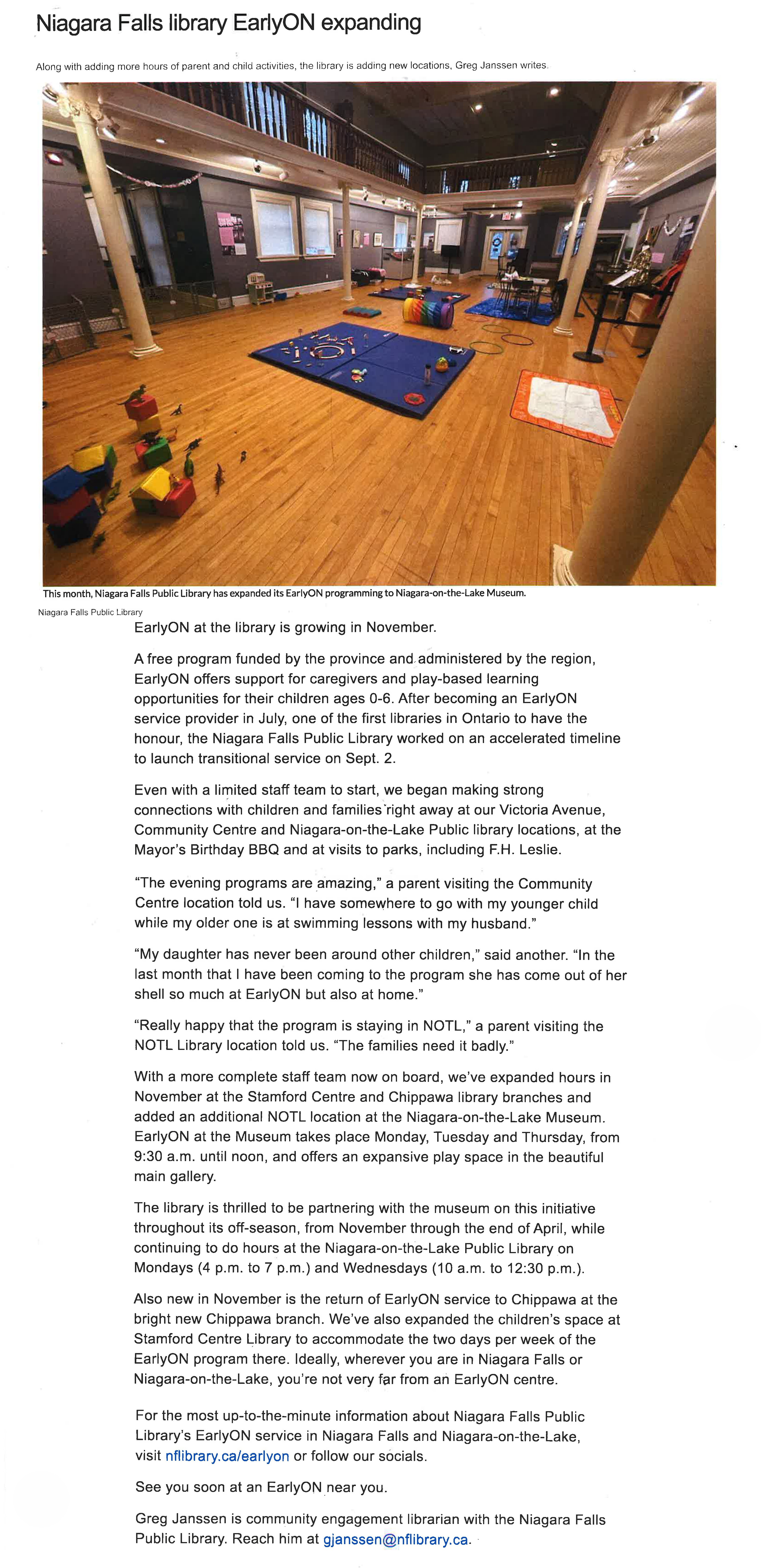 - Niagara Falls library EarlyOn expanding : Along with adding more hours of parent and child activities, the library is adding new locations