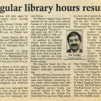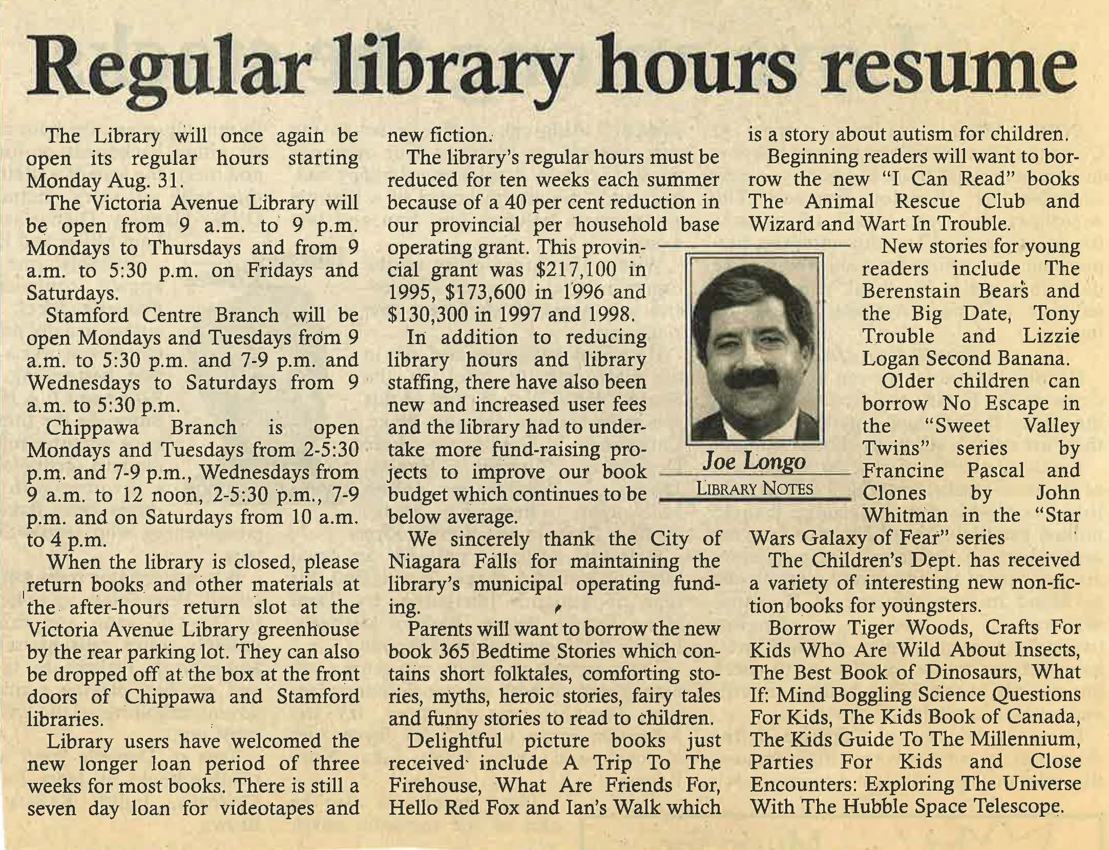 - reduced summer hours / reduced provincial operating grant / user fees / three week loan period / seven day new books