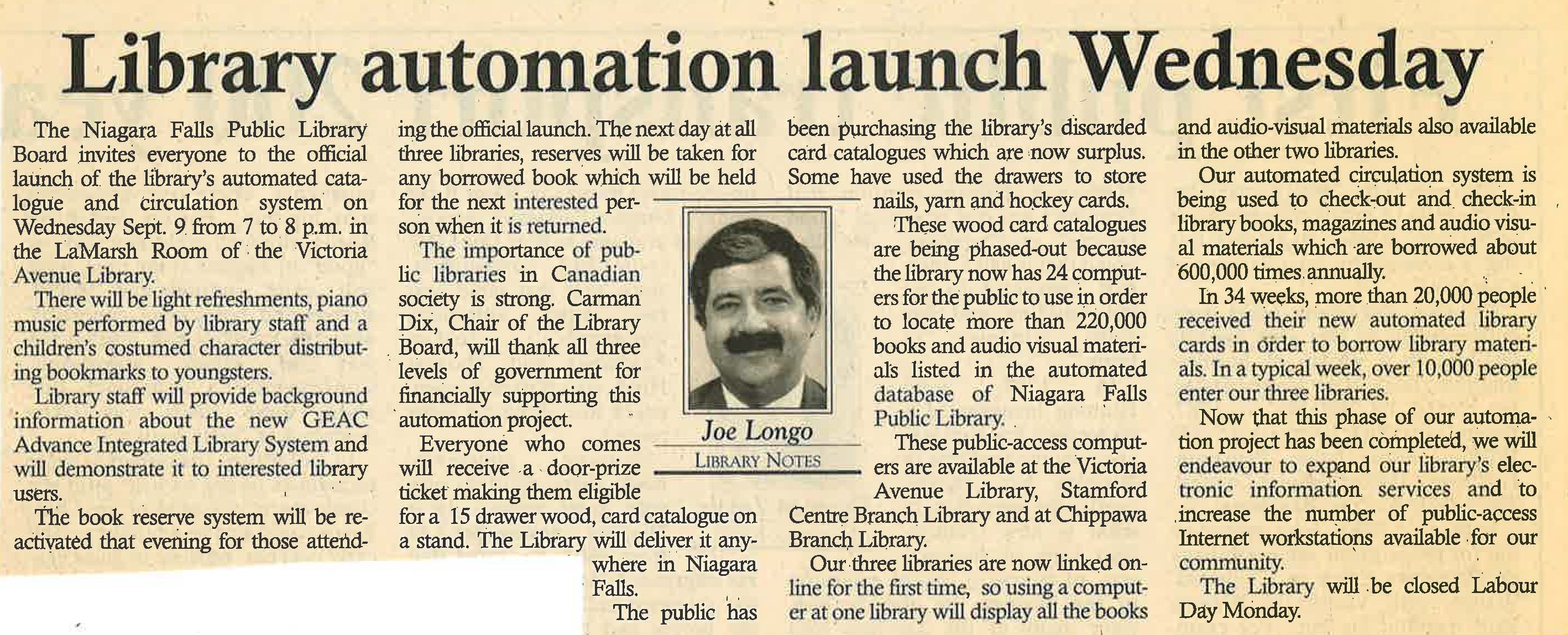 - automated catalogue & circulation system / GEAC Advance Integrated Library System / Dix, Carm / public access internet workstations