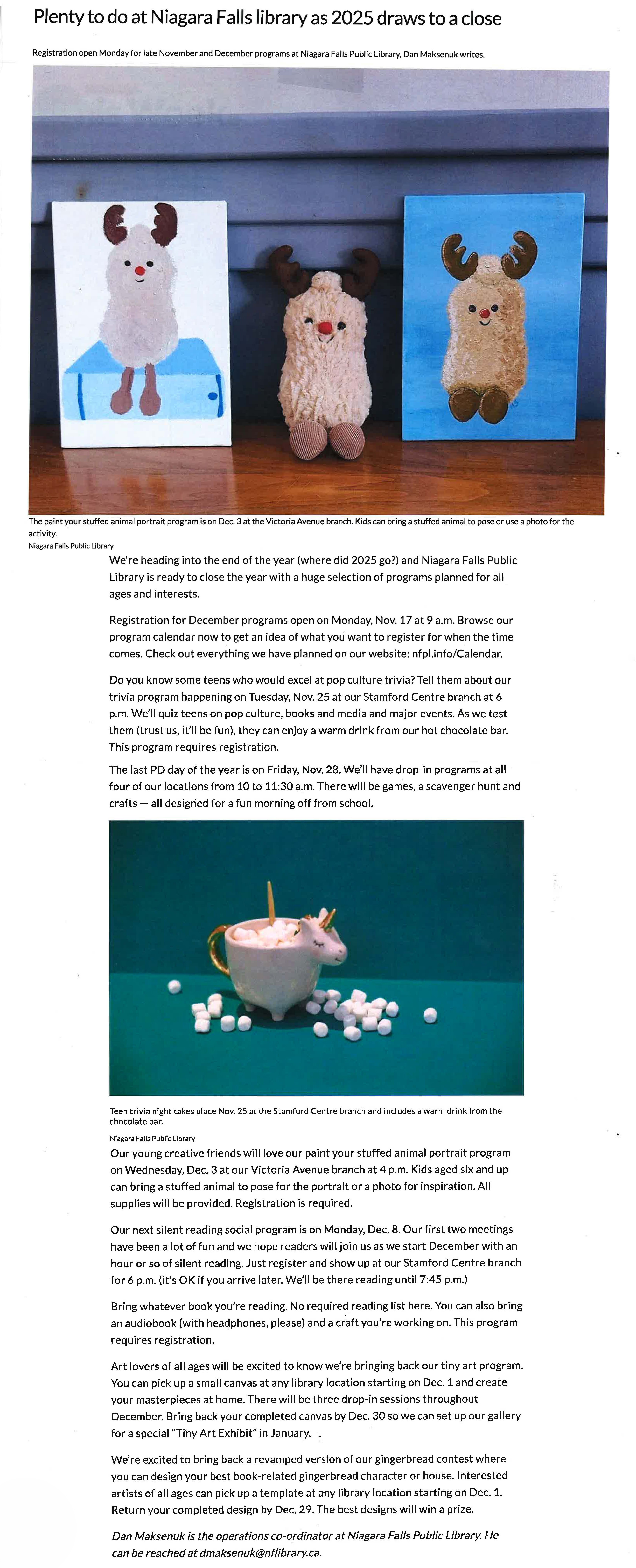 - Plenty to do at Niagara Falls library as 2025 draws to a close : Registration open Monday for late November and December programs at Niagara Falls Public Library