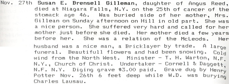 - en-CA Nov 27, 1904; died Nov 25th Niagara Falls, N.Y.; husband: bricklayer; daughter of Angus Reed and Mrs. Gillean (relation of the McLeods)