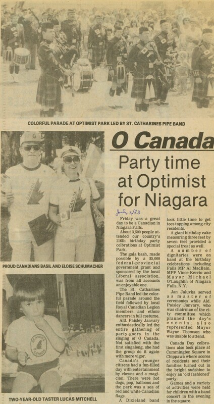 - en-CA Review, July 2, 1983. / Canada Day / St Catharines Pipe Band / Schumacher, Basil / Schumacher, Eloise / Mitchell, Lucas / Optimist Park