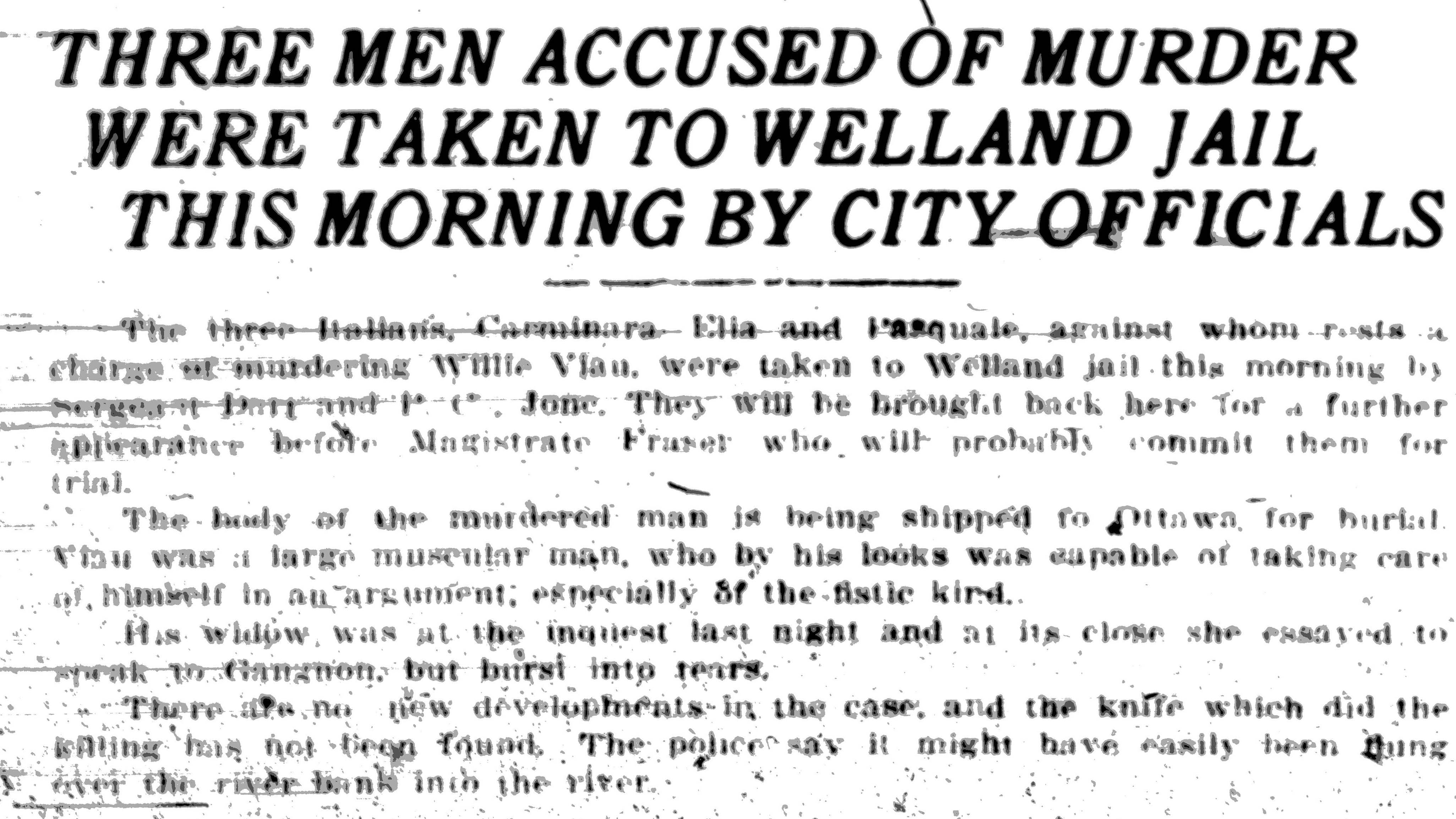 - Three men accused of murder were taken to Welland jail this morning by city officials / Review, January 28, 1919