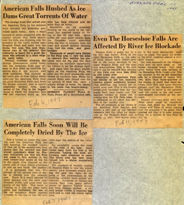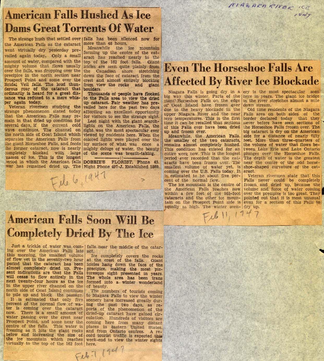 - en-CA Review, Feb 6, 1947. Even the Horseshoe Falls are affected by river ice blockade Feb 11, 1947. American Falls soon will be completely dried by the ice Feb 7, 1947. Frozen falls.