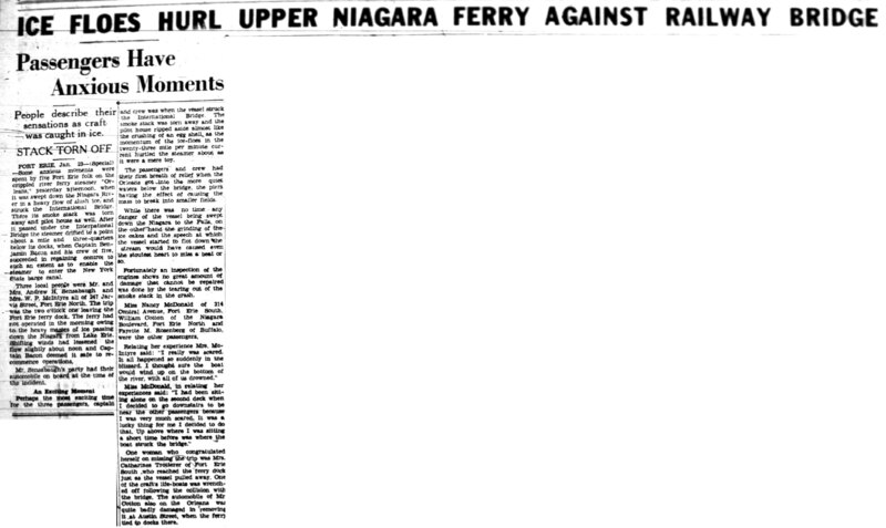 Ice floes hurl Upper Niagara Ferry against railway bridge