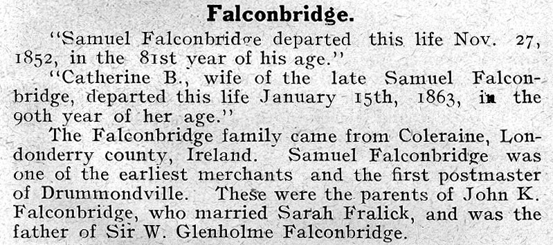 - en-CA husband of Sarah Fralick; father of Sir W. Glenholme Falconbridge;