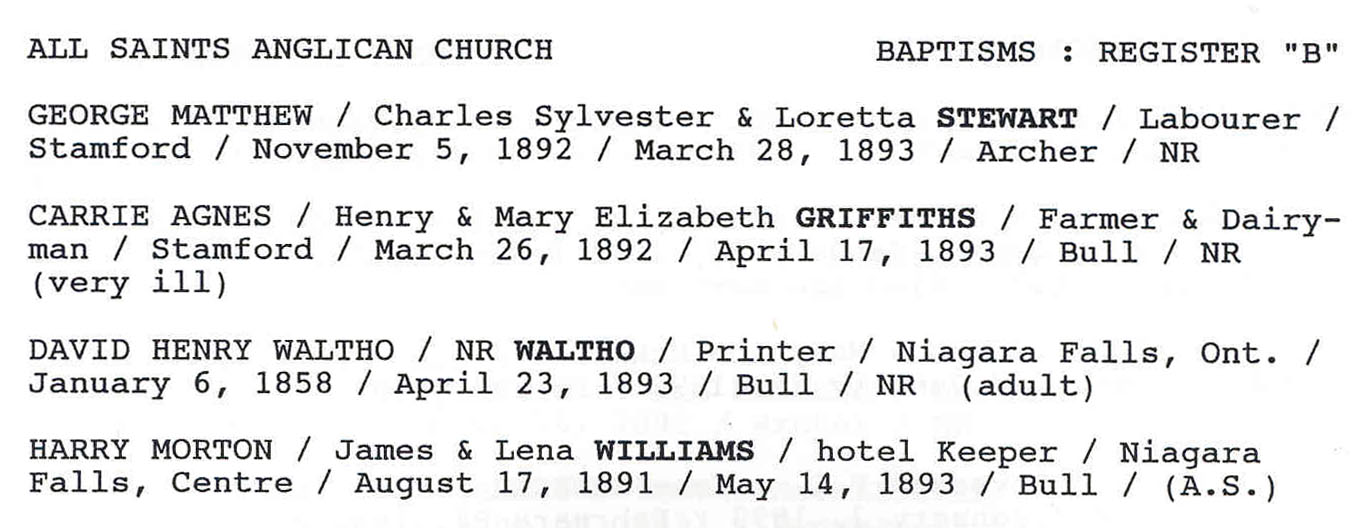 - Baptisms register B, All Saints Anglican Church, Niagara Falls, 1887-1901.
